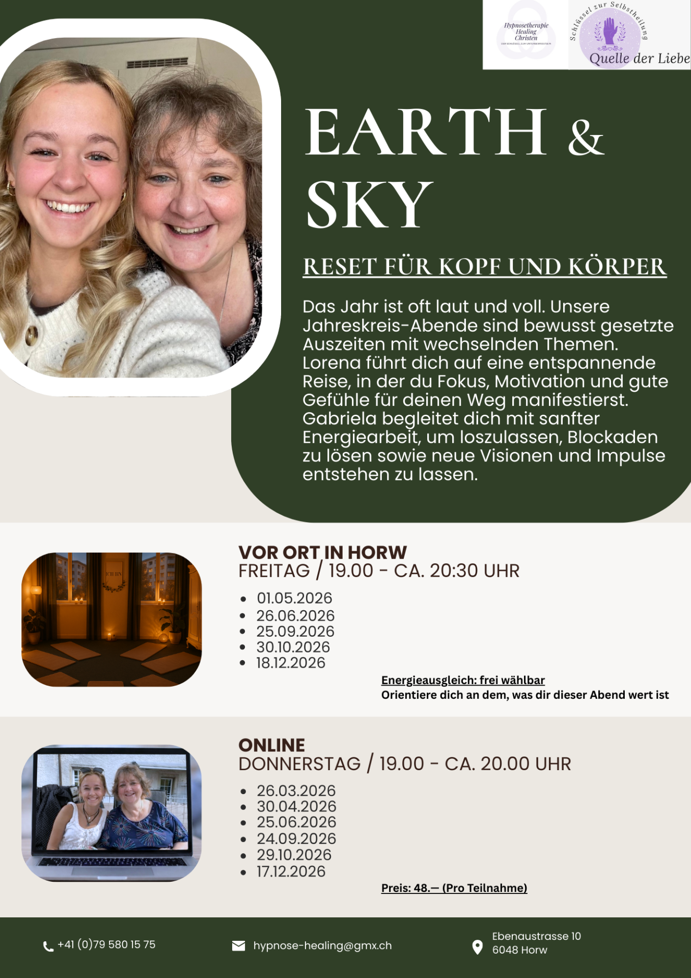 Earth & Sky ist ein bewusst gesetzter Jahreskreis-Abend, der dich zurück in deine Mitte bringt. In einer geführten Entspannungsreise begleitet dich Lorena Christen https://www.hypnosetherapie-healing.ch/ in einen Zustand von Ruhe, Klarheit und neuer Ausrichtung. Ich unterstütze dich parallel mit sanfter Energiearbeit, damit du loslassen, Blockaden lösen und neue Impulse entstehen lassen kannst. Du kannst online oder in der Praxis in Horw in einer kleinen Gruppe teilnehmen. Vor Ort erwartet dich eine warme Atmosphäre mit Tee und zum Abschluss eine Botschaft für die Gruppe.